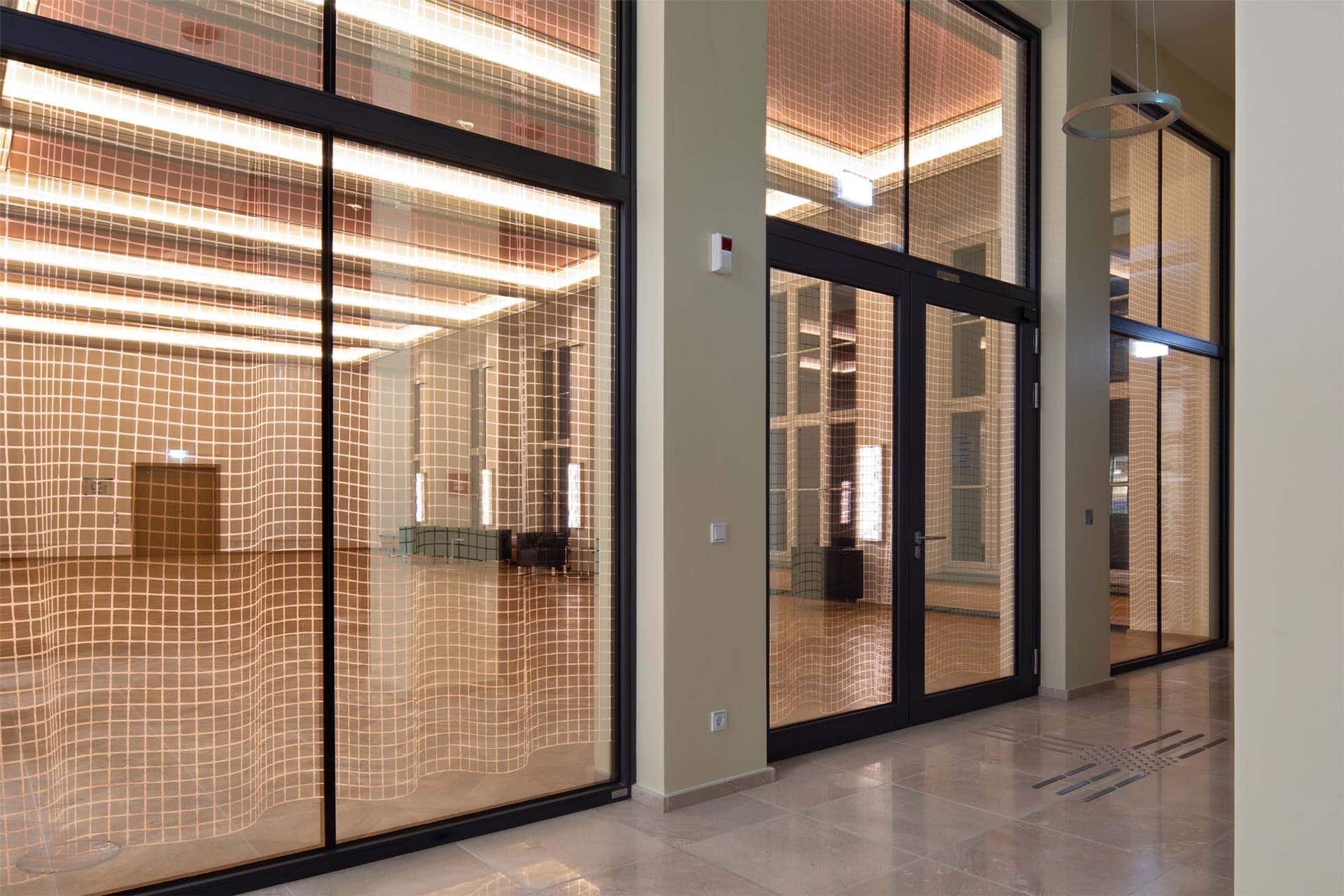Entstanden ist jetzt eine Art Spiegelsaal mit grafisch gestalteter reflektierender pyrolytischen Beschichtung auf Flachglas.