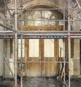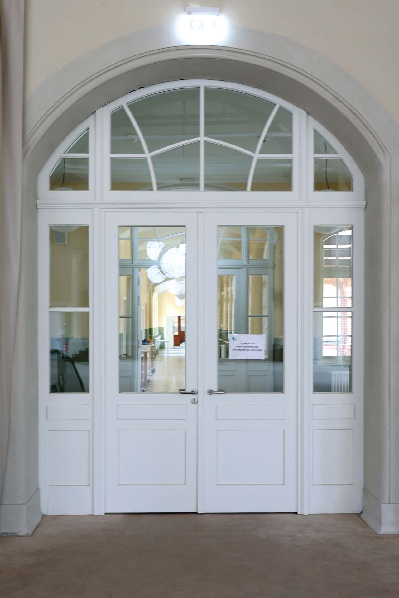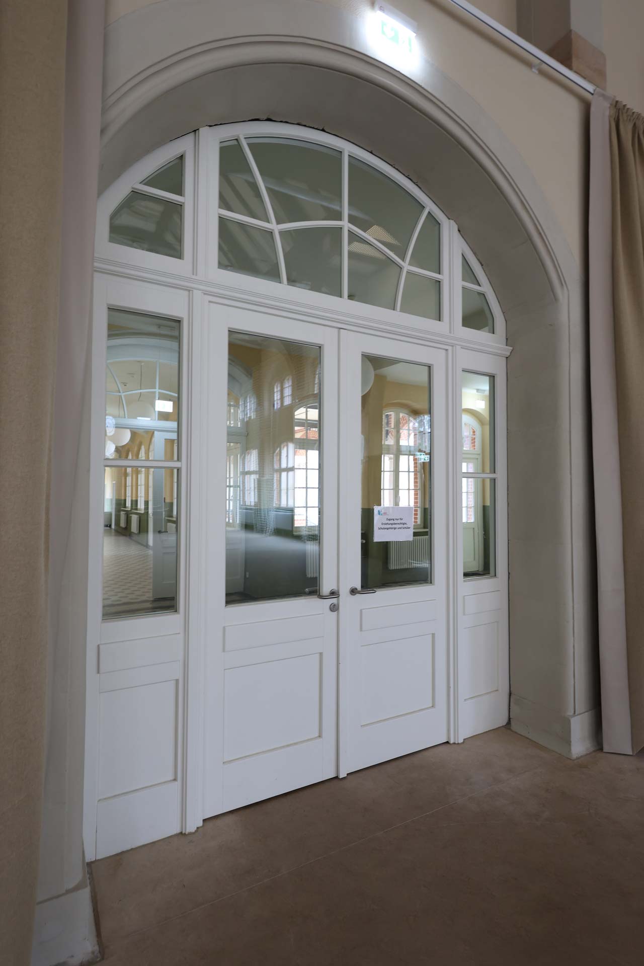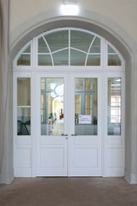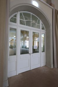 Nach historischem Vorbild wurde die Massivholzrahmentür T30 für den Innenbereich im ehemaligen großen Speisesaal gebaut. Besonders sind die Kassettenfüllungen, mit gekoppelter Festverglasung und das Oberlicht nach Denkmalschutz Anforderungen.